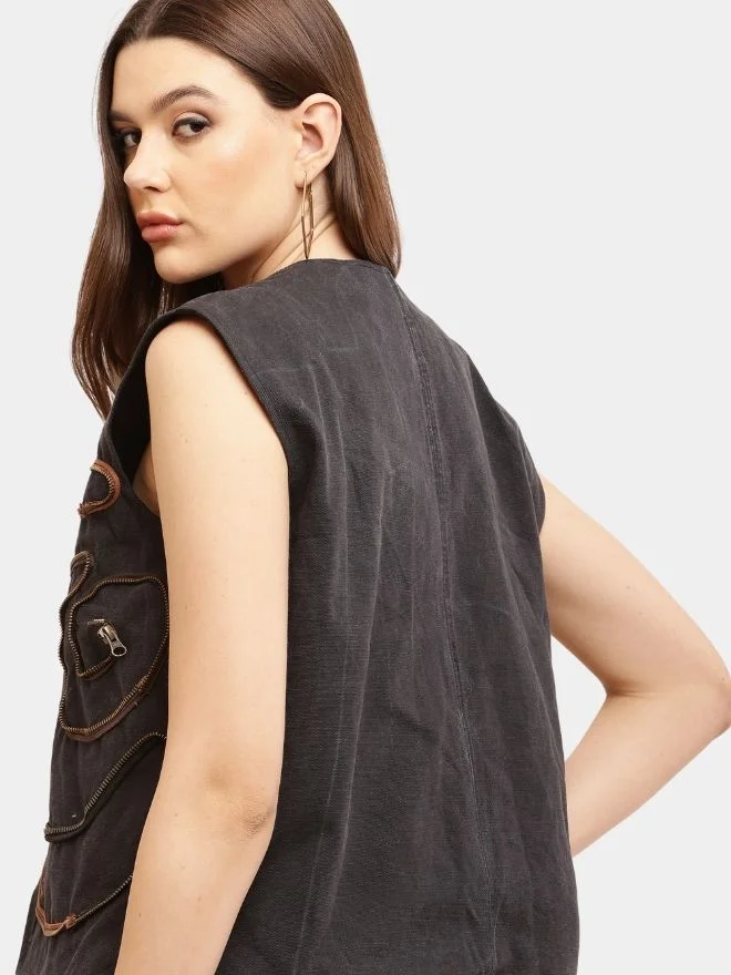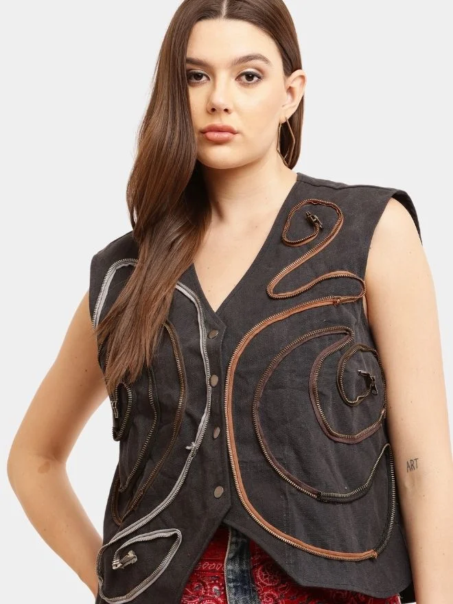 Carefully arranged across the surface of the vest coat, the weathered zipper details create a layered and visually dynamic design, giving the piece a sophisticated and premium vintage appeal. The arrangement highlights the beauty of worn materials while introducing a bold contemporary silhouette.