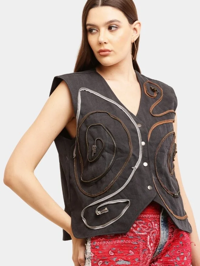 The Vintage Zipper Denim Vest Coat is a statement piece that blends heritage denim with innovative design. Inspired by the character and texture of aged zippers found on vintage denim jackets and dungarees, this garment transforms functional hardware into a striking decorative element.
