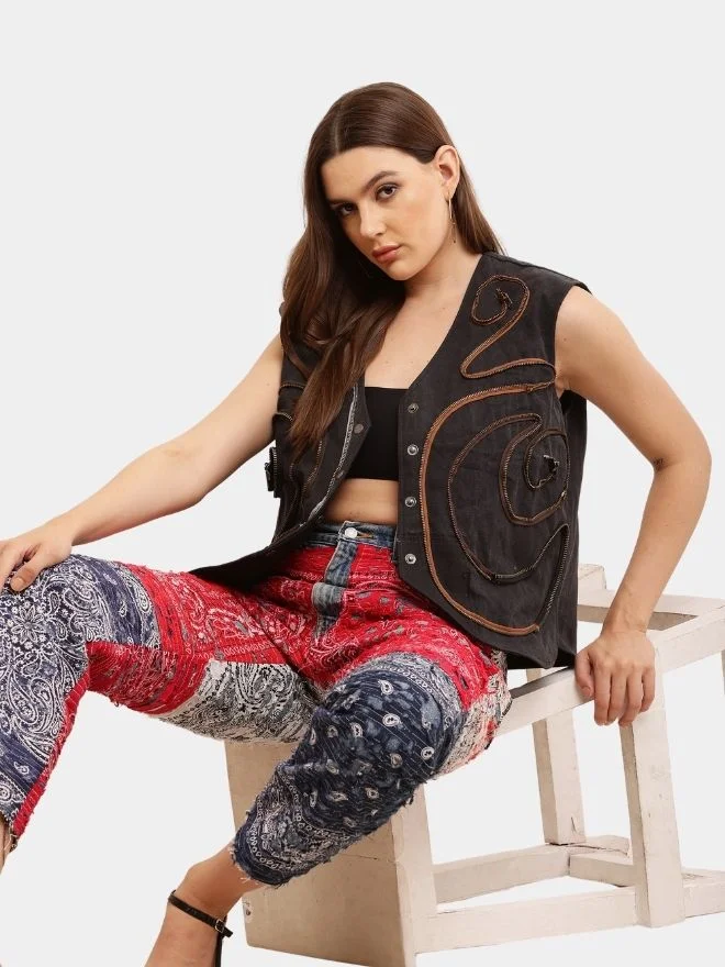 Because every piece is handcrafted from repurposed vintage denim, each vest coat carries its own unique zipper placement, denim shade, and vintage character—making it a one-of-a-kind garment.