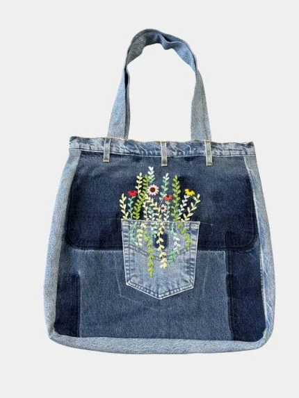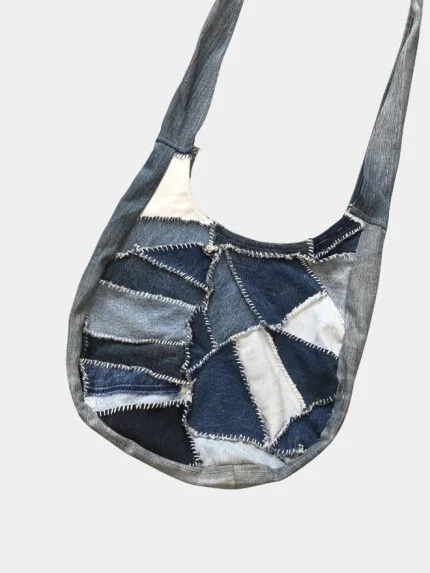 This bag is crafted from repurposed vintage denim belt sections, reducing textile waste and promoting eco-friendly fashion through creative upcycling.