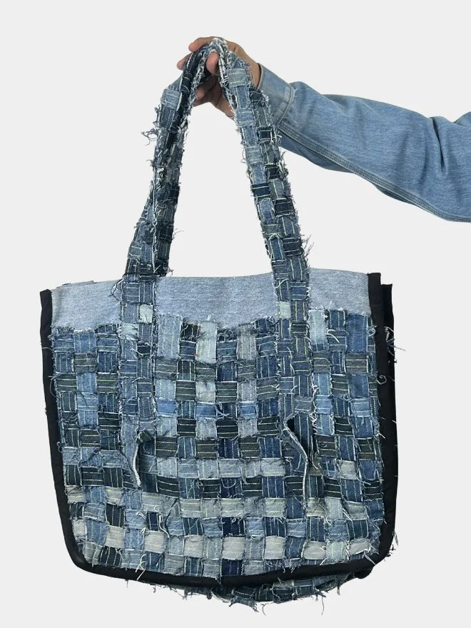 The weaving technique creates depth and structure, highlighting the rugged beauty of vintage denim while giving the bag a contemporary handcrafted aesthetic. The tonal shades of denim blend seamlessly, resulting in a design that feels both minimal and distinctive.